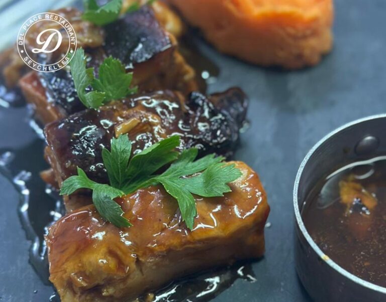 Baked in banana leaf with breadfruit croquettes, coconut-lemongrass sauce, salsa, Creole chutney, and rice — a true taste of Seychelles.